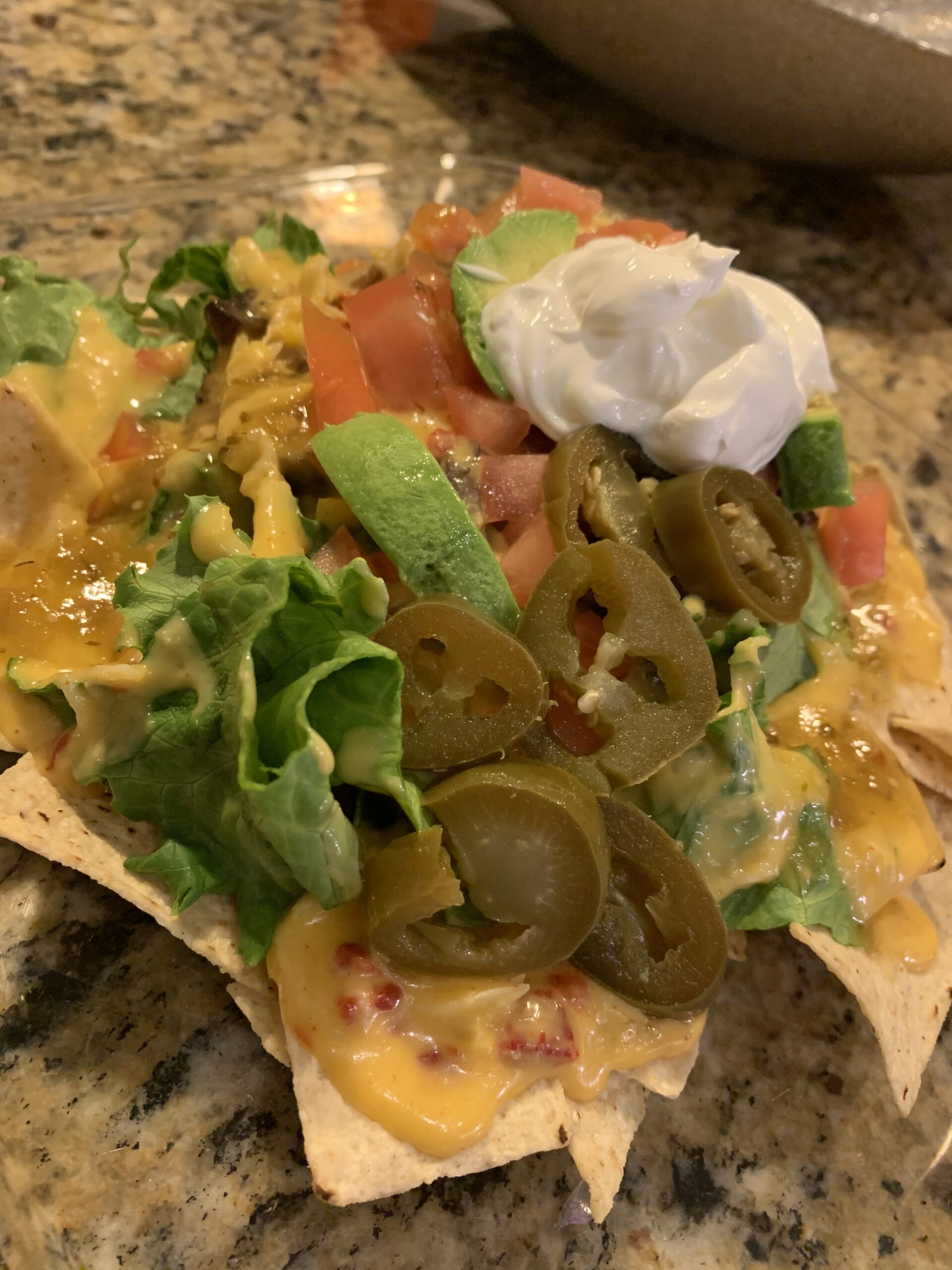 Add what your heart desires tortilla chips, cheese, lettuce, black beans, mushrooms, diced tomatoes, sliced avocado, jalapeños, green salsa and sour cream.
